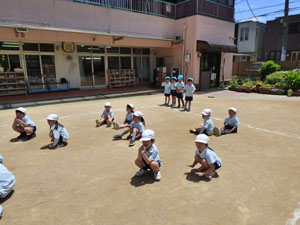 年長 白組と青組のドッジボールの様子です。年長になってから初めてのドッジボールです。 年中からドッジボールに親しみ取り組んでいます。しっかり受けて、力強く投げます。 ボールに当たって泣きだす子はいませんでした。今日の結果は13対4で青組の勝利でした。