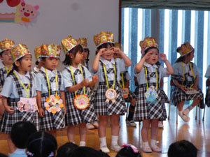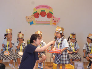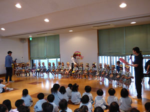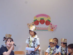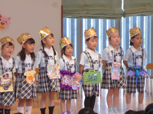 4月5月生まれのお誕生会がありました。保護者の方を招いてのお誕生会はコロナ以降4年ぶりです。 お母さん手作りの首飾りをつけてたくさんの拍手の中、入場です。一人ひとりマイクで、お名前や 将来の夢、頑張りたい事、好きな食べ物など堂々とお話ししました。最後は先生達から、 三匹の子豚のペープサート劇のプレゼントがありました。