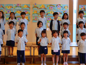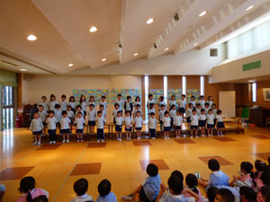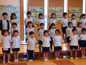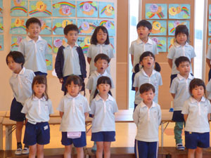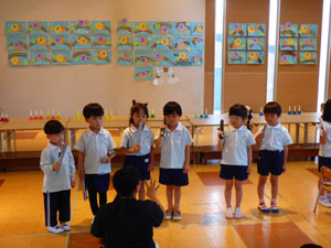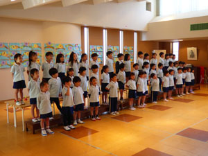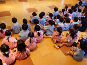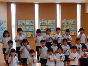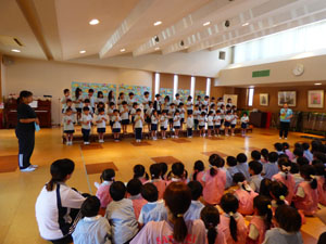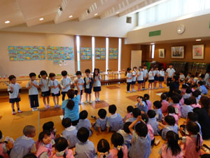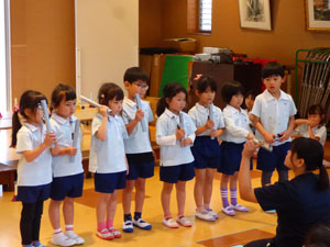 年長さんが保育参観で保護者の方に見て頂くトーンチャイム、ハンドベル、 お歌を年中さん・年少さんに披露しました。普段はにぎやかな年中さん・年少さんも真剣に 聴いていました。最後は多くの拍手で「上手だった!」とみんな褒めていました。
