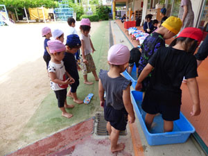 少し前になりますが、年中さんのお楽しみの行事の泥んこ遊びをしました。最初は体や服が