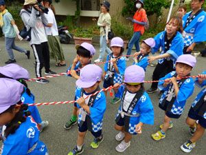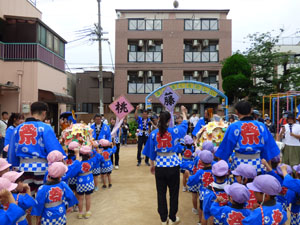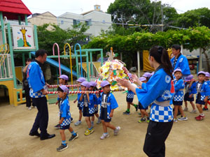 当園では「さつきまつり」という名で園の外を歩くおみこし巡行を昭和54年より行っております。 おみこし巡業を参観形式でご覧いただきました。年中さんは外周を2周と距離が長かったのですが、 元気な「わっしょい」というかけ声とともに、最後まで頑張りました。お手伝いのお父さん、 暑い中ありがとうございました。 (保護者の方々からのアンケートは、保護者の皆様からの声のコーナーに掲載していますのでご覧ください。)