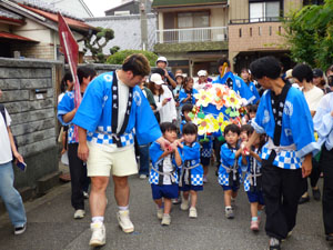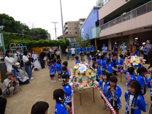 今日は年少さんが楽しみにしていたおみこし巡行でした。この日の為にお歌も手拍子も 一生懸命練習しました。おうちの人が見守ってくれる中、無事に園外を巡行することが出来ました。 小さなハッピ姿もとても可愛かったですね。 お手伝いのお父さん、見に来て下さった保護者の方々ありがとうございました。 (保護者の方々からのアンケートは、保護者の皆様からの声のコーナーに掲載していますのでご覧ください。)