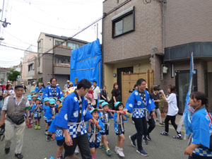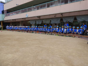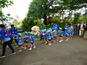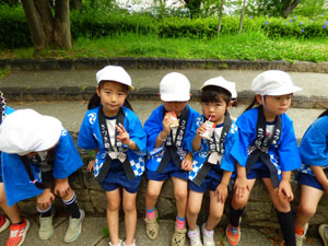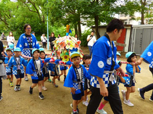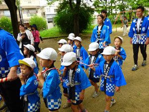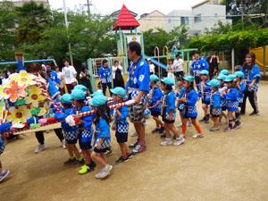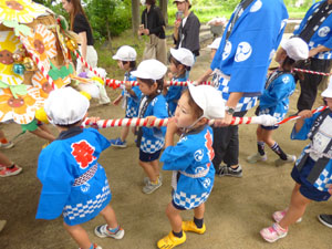 年中、年少に続いて、別日に年長がおみこしを担ぎました。近くの公園まで行き、 巡行距離が長かったのですが一人も音を上げずに頑張りました。休憩途中で飲んだリンゴジュースが 美味しかったようです。お手伝いのお父さん方、ありがとうございました。 (保護者の方々からのアンケートは、保護者の皆様からの声のコーナーに掲載していますのでご覧ください。)