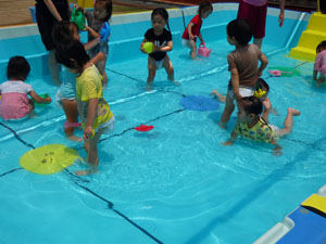 たんぽぽさんもプールに入りました。たんぽぽさん用に水深を浅くしたので怖くなかったようです。 皆でハイハイ歩きに挑戦したり、沈んだスーパーボールを拾って楽しみました。 園庭のナスも育ってきました。