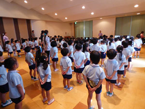 終業式を行いました。ホールに年少・年中・年長の元気なさつき園歌の歌声が響きました。 先生から夏休みの間、守ってほしいお約束のお話がありました。 その後、引っ越しになる子の紹介があり、皆で別れを惜しみました。さあ、いよいよ夏休み! 幼稚園に来ている時と同じように、早寝早起き、水分も充分に摂って元気に過ごして下さいね。