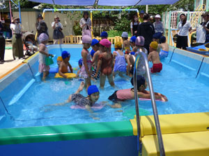 1学期にプール参観がありました。みんな少しずつプールにも慣れ、普段と変わらずプールを 楽しんでいる様子を、お家の方に見ていただく事ができました。お手伝いのお母さん、 暑い中ありがとうございました。