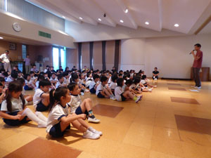夏休みが終わり、二学期の始まりです。ホールに集まり始業式を行いました。二学期から入園する お友だちと実習生の先生の紹介がありました。その後、皆でお歌を歌って体操をしました。 今学期もたくさん遊びましょうね。