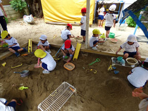 二学期のお外遊びの様子です。鬼ごっこやブランコ、シャボン玉、お砂遊びと元気いっぱいです。