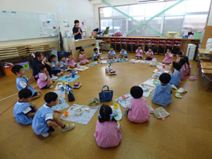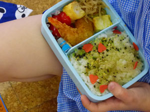 毎週水曜は大好きなお弁当の日です。お子様一人ひとりの好きなおかずが、お弁当箱に詰まって います。ひと口ふた口で食べれる大きさだったり、好きなキャラクターに似せたおかずを工夫して くださっていて、お家の方の深い愛情を感じます。