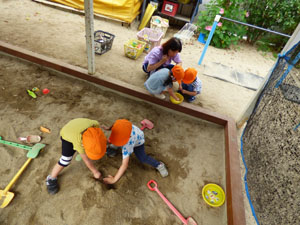 未就園児クラス(たんぽぽ組)のお外遊びの様子です。外は曇っていますが、たんぽぽ組さんは