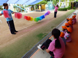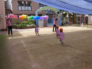 未就園児クラス(たんぽぽ組)の運動の様子です。この日はゴールテープを使ったかけっこと、