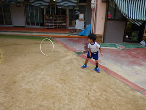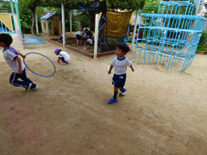 昼食後の、年中藤組さんのお外遊びの様子です。涼しい日でした。運動会の練習した後ですが