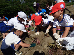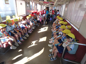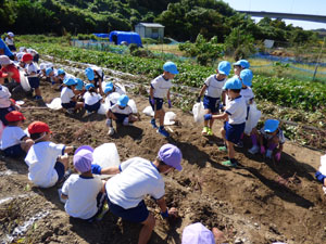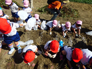 快晴の中、全学年でおいもほり遠足へ行きました。今年の畑の土は少し硬かったのですが、 農家の方の手作り竹シャベルで工夫しながら掘っていました。年長さんが年少さんに声をかけて、 一緒に土を掘るのを手伝う姿も見られました。お弁当とお菓子を食べて、電車に乗って帰りました。