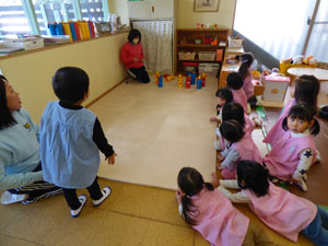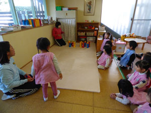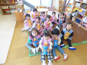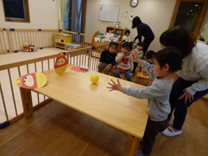 未就園児クラスのたんぽぽ組、れんげ組は節分で鬼倒しゲームをしました。れんげ組さんも、