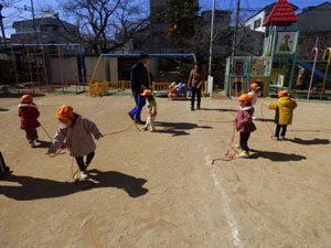 未就園児クラスのたんぽぽ組の体操の様子です。縄跳び遊びや玉入れ、ボール遊びをしました。