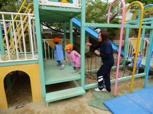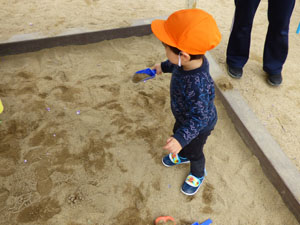 今日も元気いっぱい、たんぽぽ組さんはお外遊びを楽しんでいます。園庭開放で遊んでいたので、