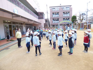 全園児集まって、朝のおはじまりをしました。転入園児の紹介がありました。
