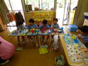 年少ホームクラス(預かり保育)のお昼ご飯の様子です。お腹いっぱい食べて、
