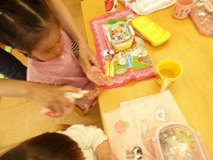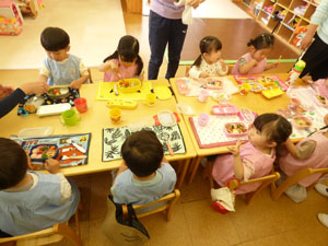 未就園児クラス たんぽぽ組もお昼ご飯がはじまりました。スプーンとフォークを使って上手に