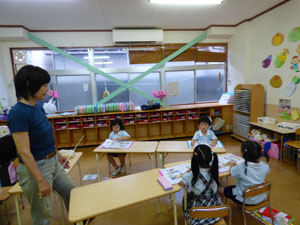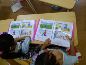 英語(課外)の様子です。経験豊富な先生が、毎週楽しく英語を教えてくださいます。 この日は教材やカードを使っていました。子どもたちは柔軟に言語を習得できるようで、 年長さんは好きな色を英語で話していました。