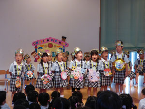 6月7月生まれのお友達のお誕生日会をしました。おうちの人が作ってくれたメダルを付けて、