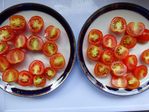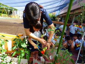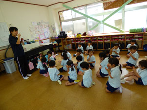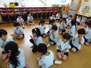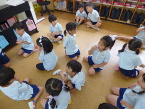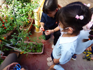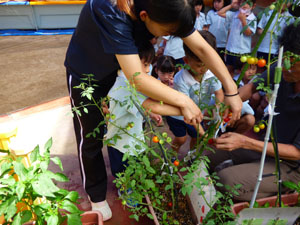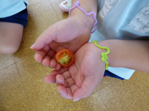 年中の藤組さんは先日ピーマン二回目の収穫をして、美味しくいただきました。軽く火を通した だけのピーマンですが、水やりを頑張ってきたので愛着がわくようです。そして本日は年中の 桃組さんがミニトマトを収穫して食べました。トマトが苦手だった子も「美味しい!」「甘い♪」 と言って食べれました。自分たちが育てた野菜は新鮮で美味しいですね。