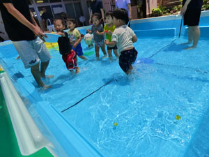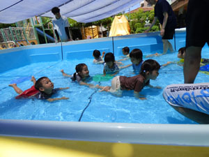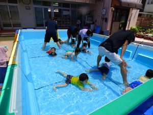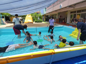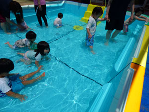 未就園児クラスのたんぽぽ組も大きなプールにはいりました。わにさん泳ぎを積極的にする
