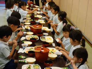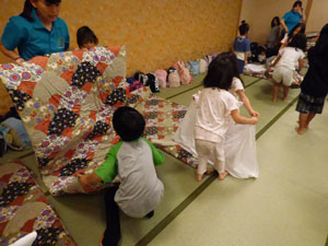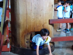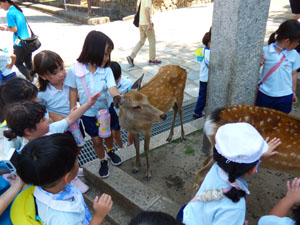お泊り保育の2日目です。7時起床。みんなでふとんを片付けてから体操をして朝食をいただき ました。その後に東大寺まで歩いて大仏さんをおまいりして、鹿さんたちに触れ合いました。 バスで帰りました。おうちの方と離れての1泊の旅がんばりました。成長してくれたと思います。