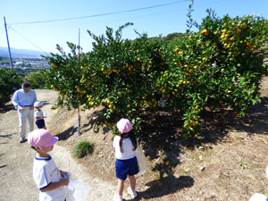 10月23日に秋のみかんがり遠足に全園児で行きました。電車に乗って駅から歩きました。 昨日の雨がうそのようにとても良い天気でポカポカ陽気で、みかんがりを楽しみました♪ 採って食べたみかんは甘酸っぱくてとても美味しかったです。みんなで食べたお弁当も おいしかったね♪体力もついた楽しい遠足でした!