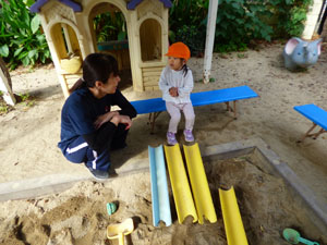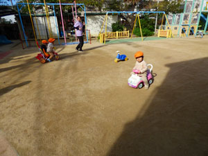 満2歳児クラスのれんげ組さんが園庭で遊んでいる様子です。ミニバイクと滑り台、お砂場遊びを