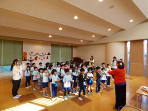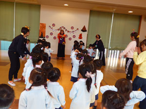 10月29日の正課の英語の時間にハロウィンのリレーのゲームをしたり、お歌を歌ったりして