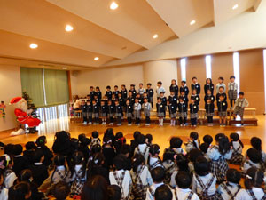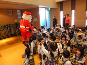 2学期の終業式でクリスマス会を行いました。サンタさんがやって来て、みんなにプレゼントを