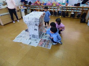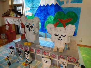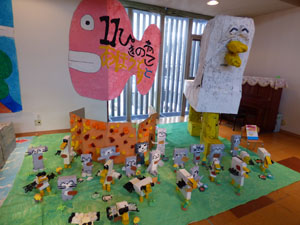 2/14(土)に作品展がありました。個人作品と共同作品が並べられました。今回のテーマは 「絵本の世界」です。年中さんの実際に冬の野菜のを見て描いた絵はとても特徴をとらえて いました。たくさんの保護者の皆様に見てもらい楽しんでもらいました。